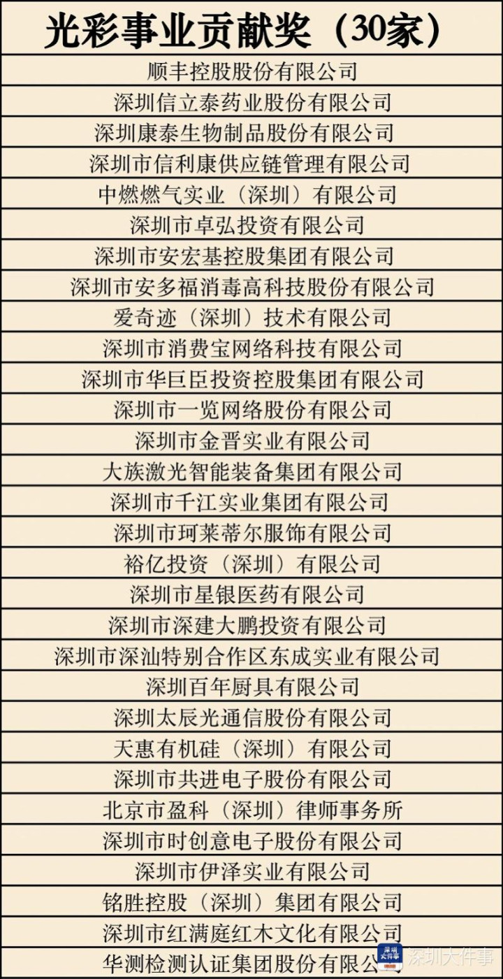 为表彰先进、树立典型,进一步激励深圳市广大非公有制经济人士、新的社会阶层人士和民营企业坚定做中国特色社会主义的建设者、中国式现代化的促进者,更加积极投身光彩事业,市委、市政府决定,授予丁强强等60人“深圳市非公有制经济人士优秀中国特色社会主义事业建设者”称号,授予顺丰控股股份有限公司等30家企业“深圳市光彩事业贡献奖”。